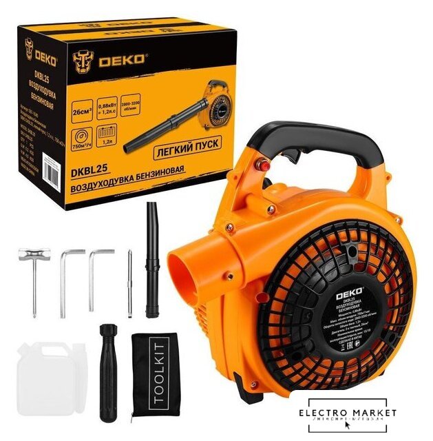 Комплектация | - Воздуходувка - 1 шт.- Верхняя труба подачи воздуха - 1 шт.- Нижняя труба подачи воздуха - 1 шт.- Емкость для топлива - 1 шт.- Мешочек для инструментов - 1 шт.- Свечной ключ - 1 шт.- Шестигранный ключ - 2 шт.- Двухсторонняя отвертка - 1 шт.- Руководство по эксплуатации- Коробка |