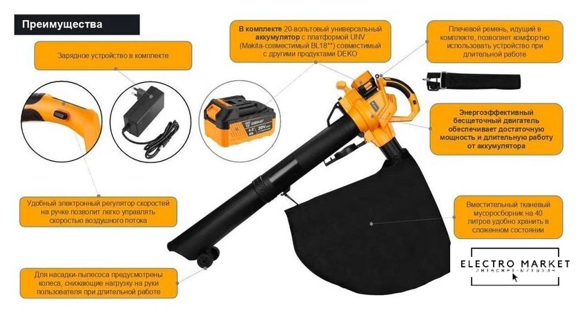 | Комплектация | - Основной корпус - 1 шт;- Верхняя насадка - 1 шт;- Нижняя насадка (нижняя насадка с колесами и нижняя насадка) - 2 шт;- Мусоросборник - 1 шт;- АКБ - 1 шт;- Плечевой ремень - 1 шт;- Зарядное устройство - 1 шт;- Руководство по эксплуатации - 1 шт. |