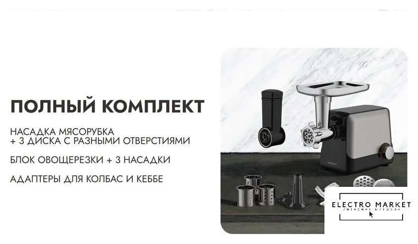 | Полная комплектация | мясорубка, диск/решетка для фарша (3 шт.), насадка для кеббе, насадка для домашней колбасы, насадка для шинковки, терка (3 шт.), загрузочный лоток, нож, толкатель, фиксирующая гайка, шнек |