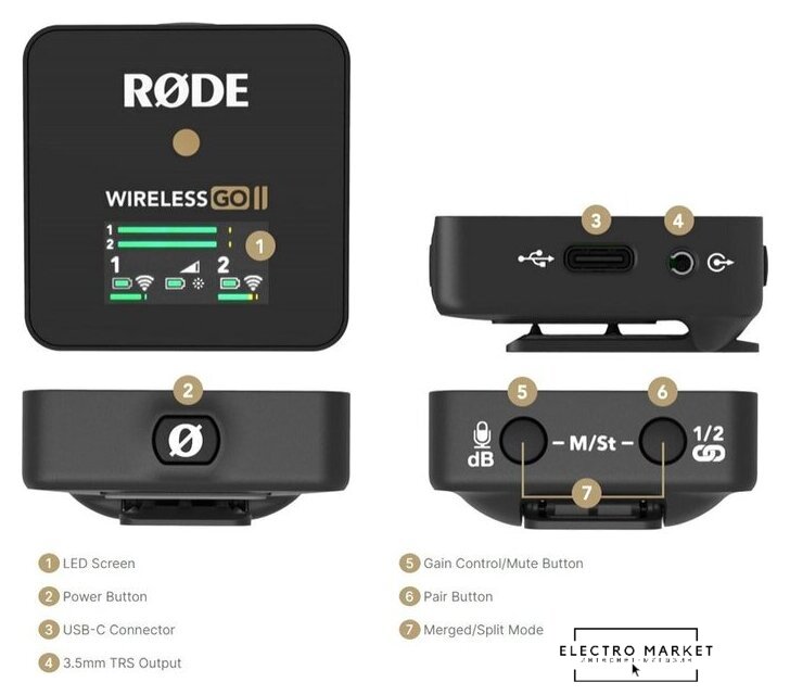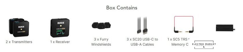 | Комплект поставки | - приемник- два передатчика- съемная ветрозащита- аудиокабель (3.5 мм - 3.5 мм)- три USB-кабеля для зарядки (USB Type-C - USB Type-A)- чехол- документация |