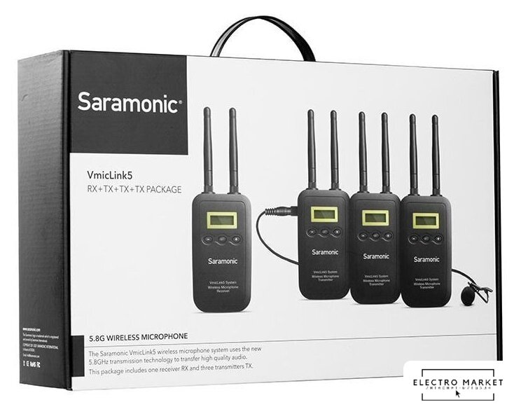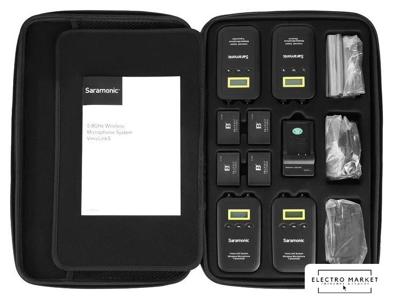 Комплект поставки | - приемник RX5;- передатчик TX5 (3 шт.);- адаптер для монтажа на камеру;- клипсы;- антенны;- перезаряжаемые батареи;- кабель 3.5 мм - XLR;- кабель 3.5 мм - 3.5 мм;- чехол;- кабели для зарядки; |