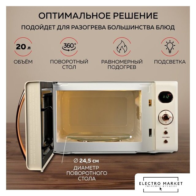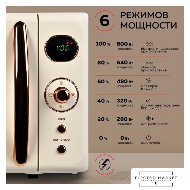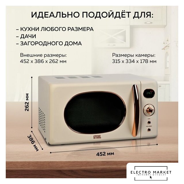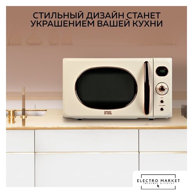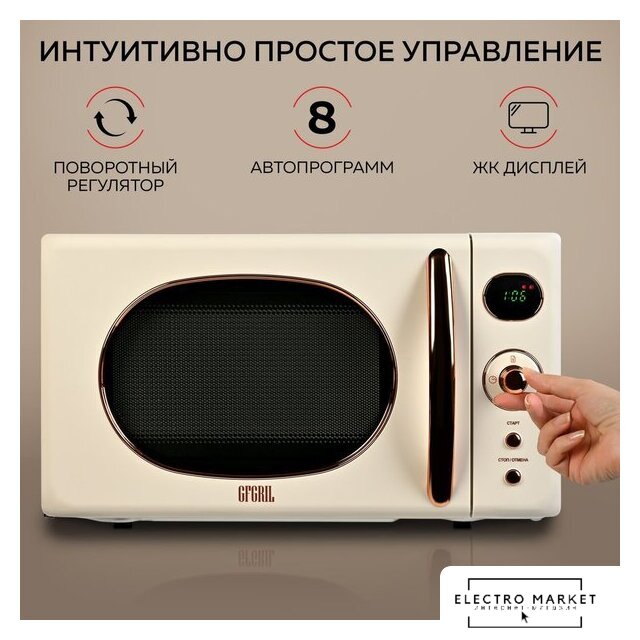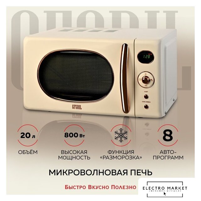 отдельностоящая, микроволны (соло), объем 23 л, выходная мощность микроволн 800 Вт, управление сенсорное, автоприготовление, авторазмораживание, цвет серый