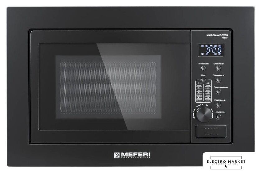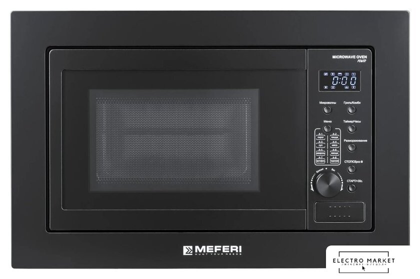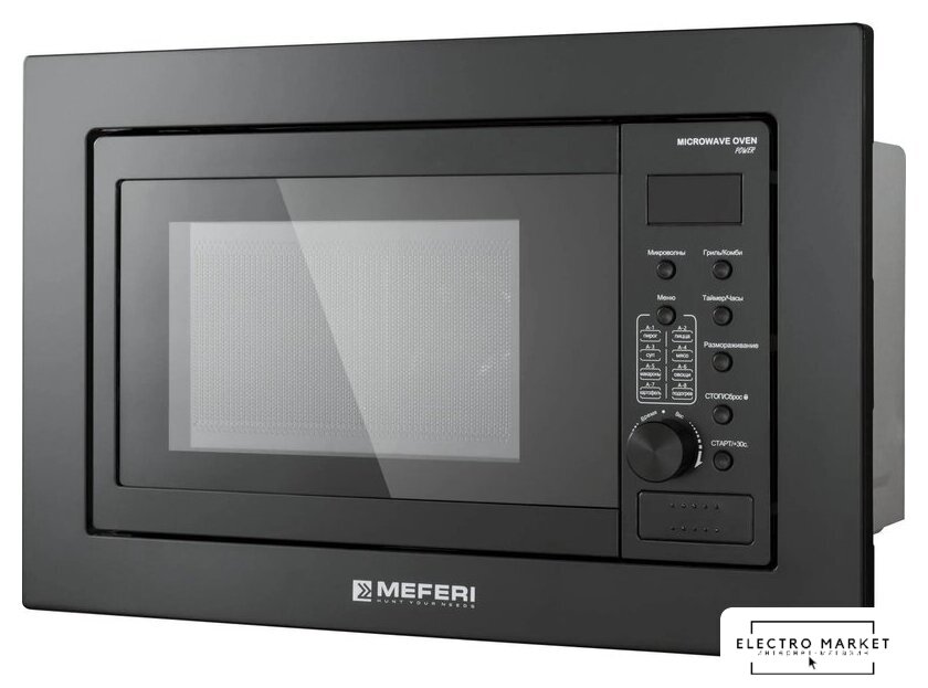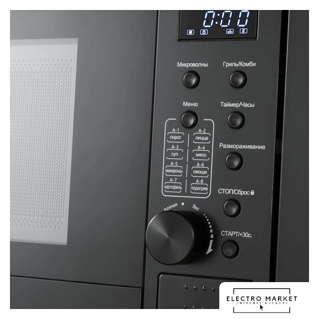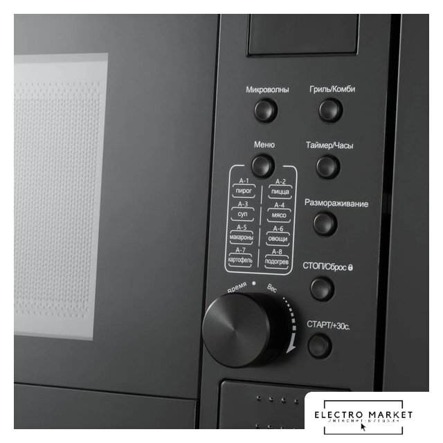 встраиваемая, микроволны (соло), объем 20 л, выходная мощность микроволн 800 Вт, управление электронное, автоприготовление, авторазмораживание, цвет черный
