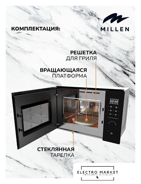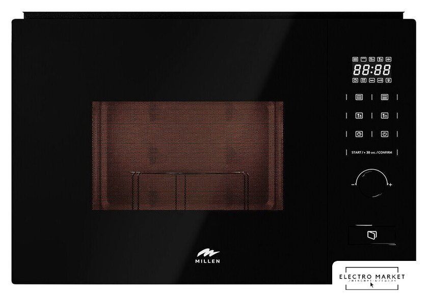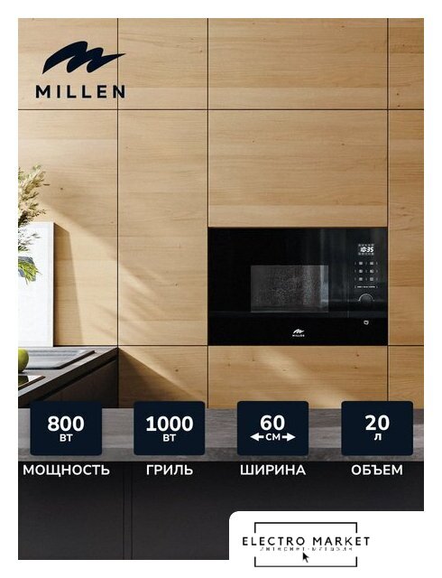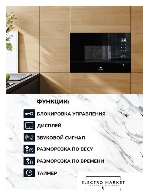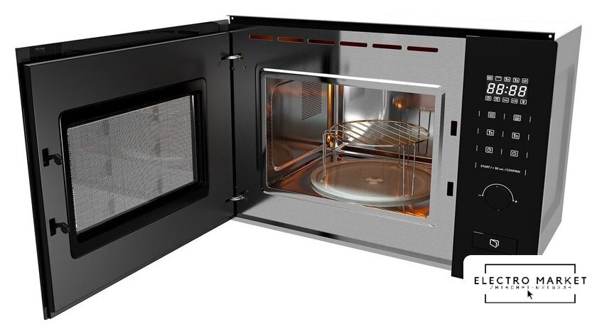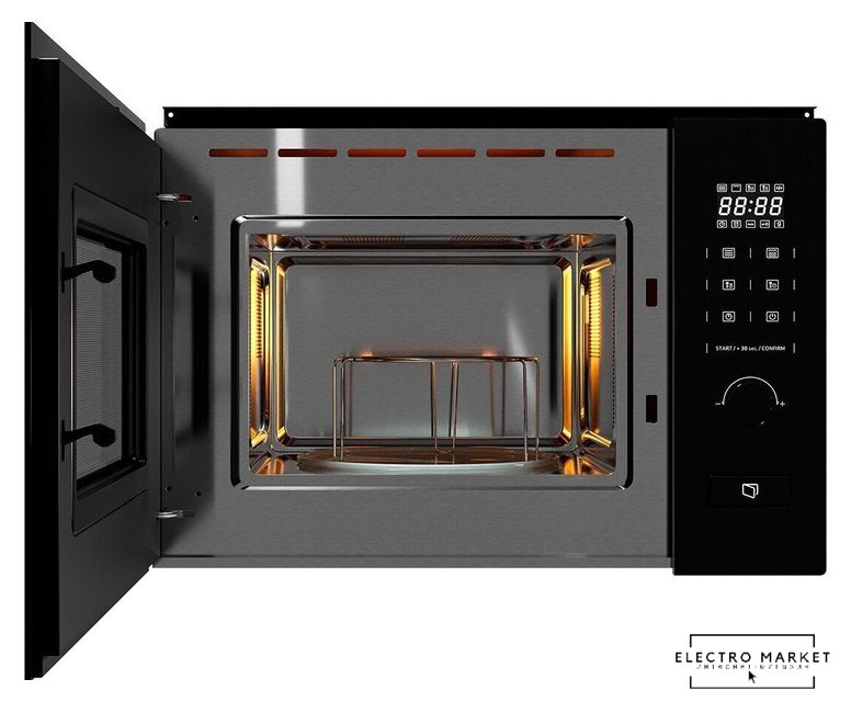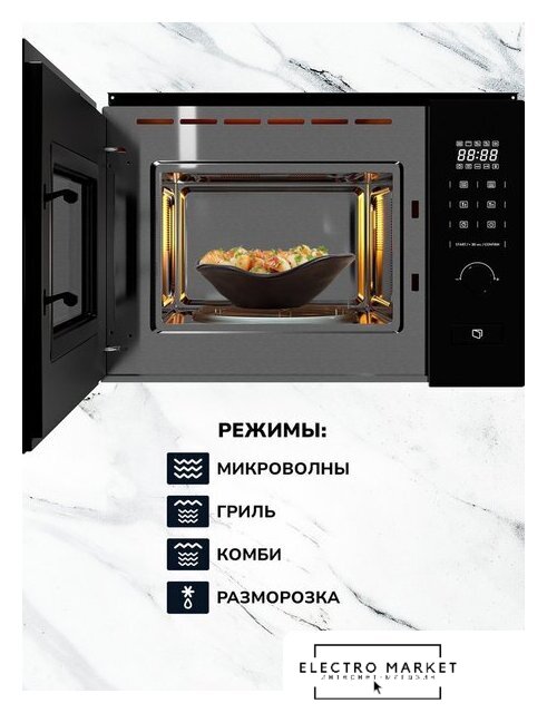 встраиваемая, микроволны и гриль, объем 20 л, выходная мощность микроволн 800 Вт, управление электронное, автоприготовление, авторазмораживание, цвет черный