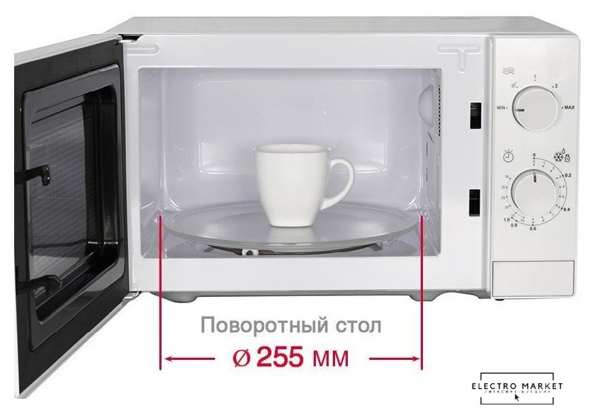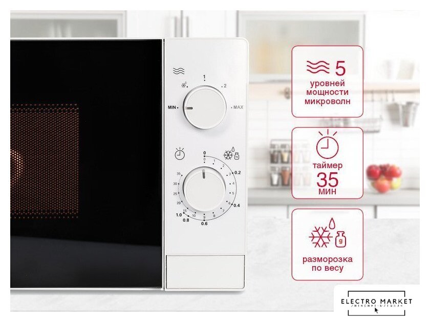 отдельностоящая, микроволны (соло), объем 20 л, выходная мощность микроволн 700 Вт, управление механическое, цвет белый