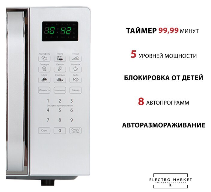 отдельностоящая, микроволны (соло), объем 23 л, выходная мощность микроволн 800 Вт, управление электронное, авторазмораживание, цвет белый/черный