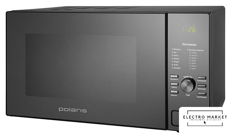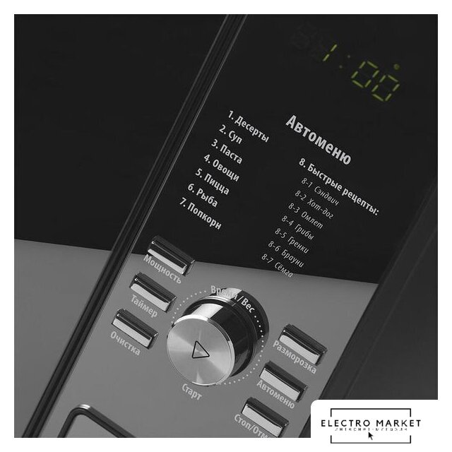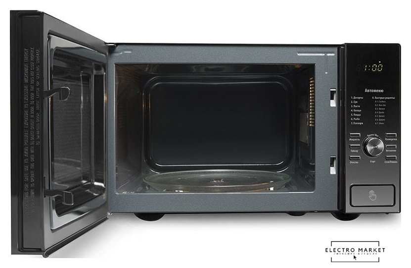 отдельностоящая, микроволны и гриль, объем 23 л, выходная мощность микроволн 900 Вт, управление электронное, автоприготовление, авторазмораживание, цвет черный