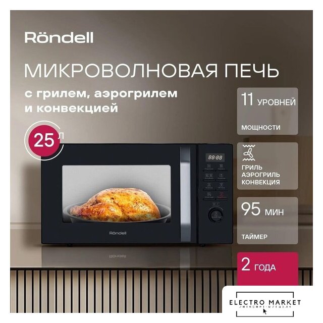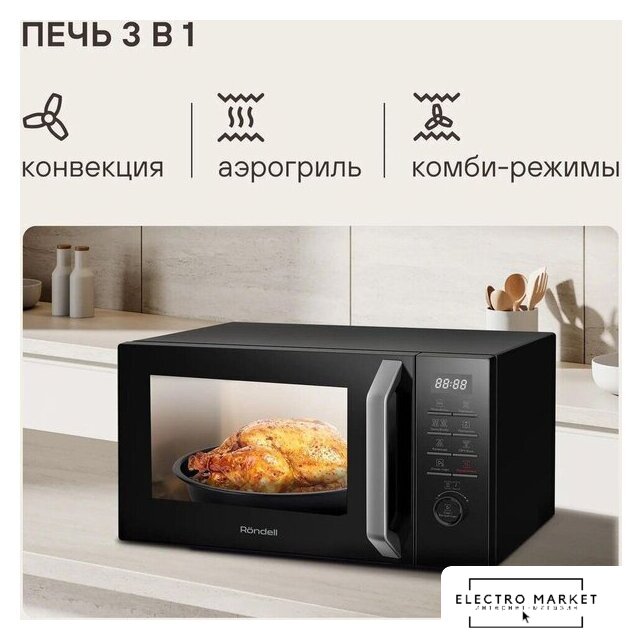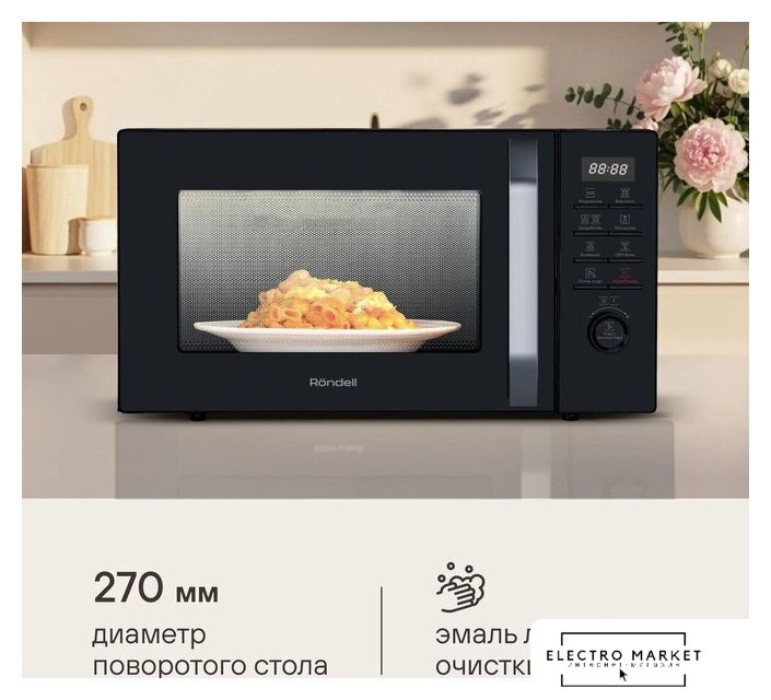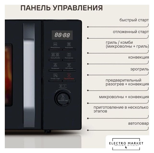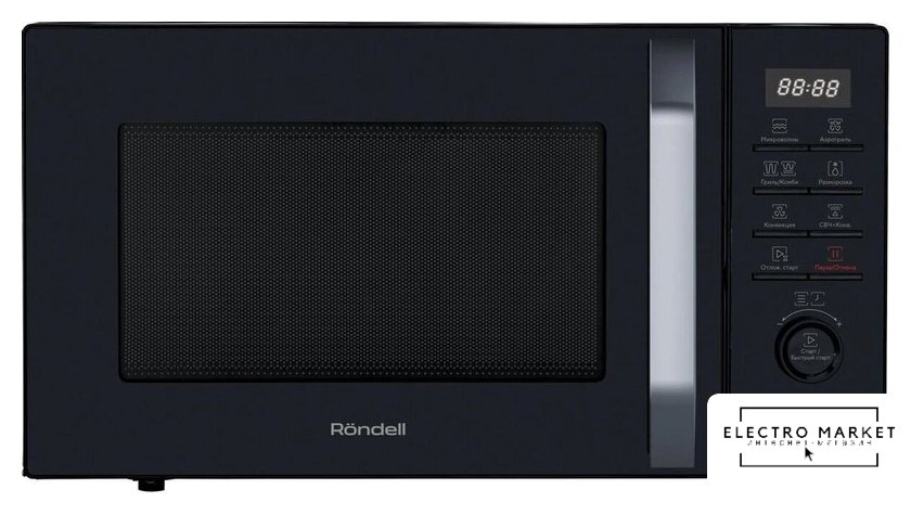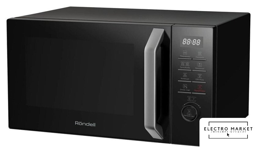 отдельностоящая, микроволны (соло), объем 23 л, выходная мощность микроволн 800 Вт, управление электронное, автоприготовление, авторазмораживание, цвет нержавеющая сталь/черный