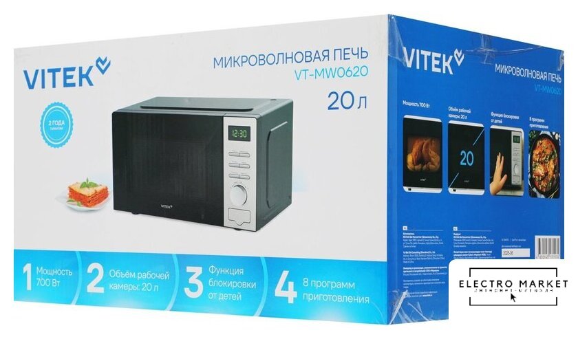 отдельностоящая, микроволны (соло), объем 20 л, выходная мощность микроволн 700 Вт, управление электронное, автоприготовление, авторазмораживание, цвет серебристый