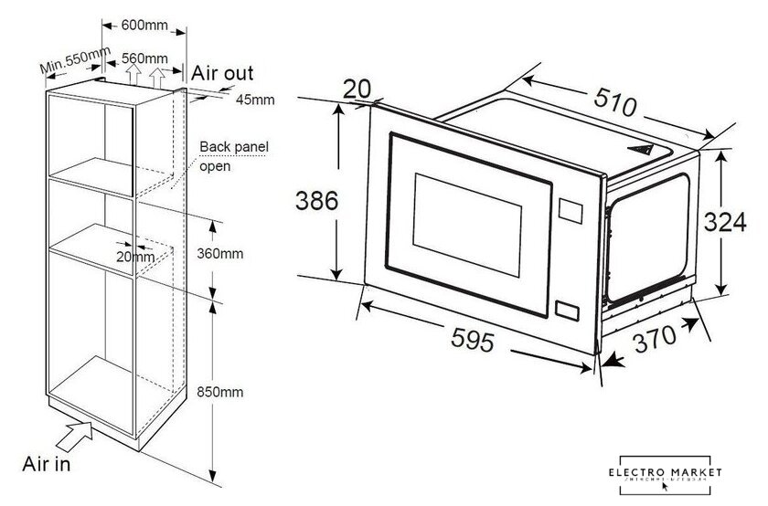 встраиваемая, микроволны (соло), объем 20 л, выходная мощность микроволн 800 Вт, управление электронное, автоприготовление, авторазмораживание, цвет черный