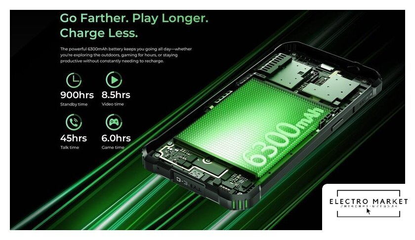 смартфон, Android, экран 6.56" IPS (720x1612) 90 Гц, Mediatek Helio G91, ОЗУ 6 ГБ, память 128 ГБ, поддержка карт памяти, камера 48 Мп, аккумулятор 6050 мАч, 2 SIM (nano-SIM), моноблок, влагозащита IP68/IP69K