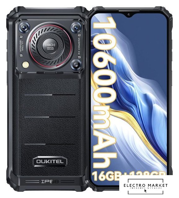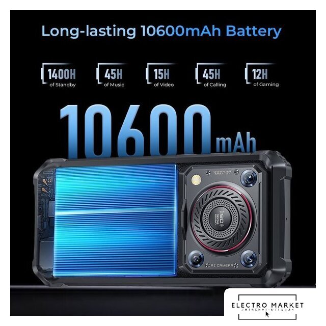 смартфон, Android, экран 6.53" IPS (720x1600) 60 Гц, Mediatek MT8788V/WA, ОЗУ 6 ГБ, память 256 ГБ, поддержка карт памяти, камера 48 Мп, аккумулятор 10600 мАч, моноблок, влагозащита IP68