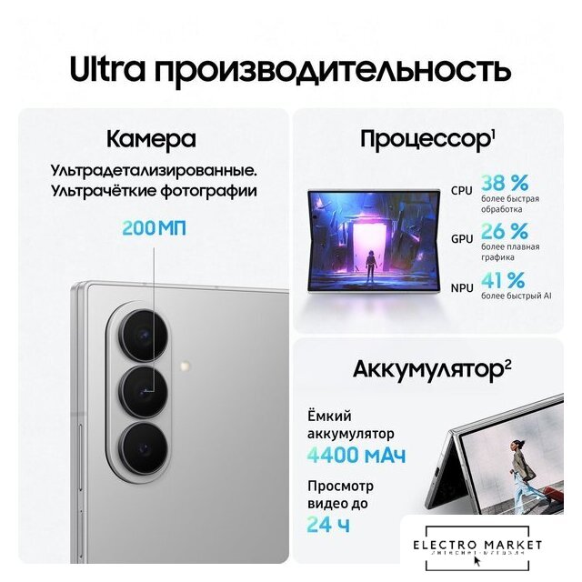 Отличия от предыдущего поколения | ✅ В Galaxy Z Fold7 реализовано несколько инноваций, которые отличают его не только от Galaxy Z Fold6, но и от любого другого складного смартфона на рынке. Во-первых, широкие дисплеи как внутри, так и снаружи. Диагональ внешнего экрана теперь составляет 6.5 дюйма, а основной экран имеет впечатляющую диагональ 8 дюймов с более широким соотношением сторон, что обеспечивает более плавную работу в многозадачном режиме.✅ И хотя дисплеи стали больше, сам смартфон значительно уменьшился в размерах и стал более портативным, чем все предыдущие Galaxy Z Fold, как в сложенном, так и в раскрытом виде. В раскрытом виде его толщина составляет 4.2 мм, а в сложенном — 8.9 мм, что делает его примерно на 25% тоньше Galaxy Z Fold6.✅ В сложенном состоянии экран Galaxy Z Fold7 имеет соотношение сторон 21:9, аналогичное соотношению сторон у премиальных смартфонов моноблокового типа. Такое улучшенное соотношение сторон обеспечивает удобство и естественность набора текста, а также повышает производительность. |