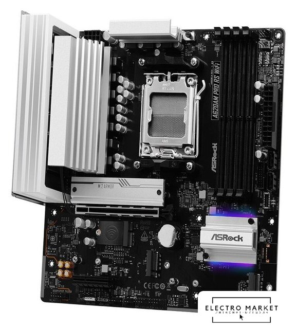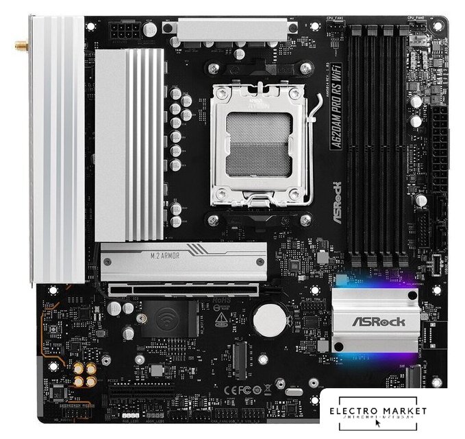 mATX, чипсет AMD A620A, память 2xDDR5 до 7600 МГц, слоты: 1xPCIe x16 4.0, 1xPCIe x1, 1xM.2, 6+2+1 фаз питания