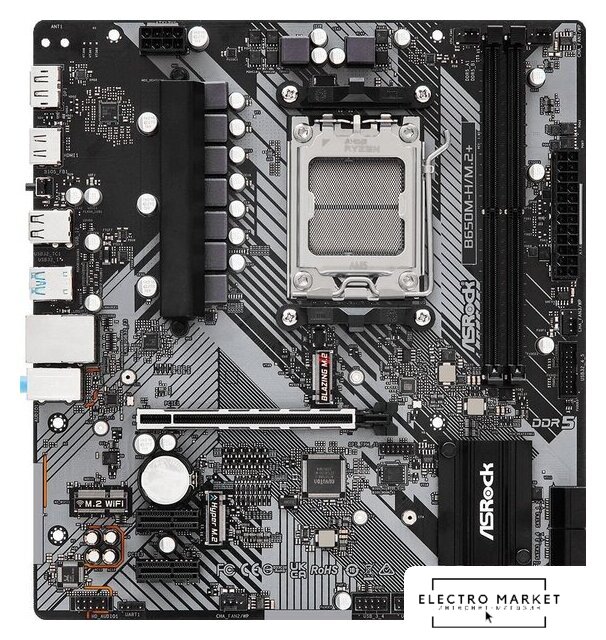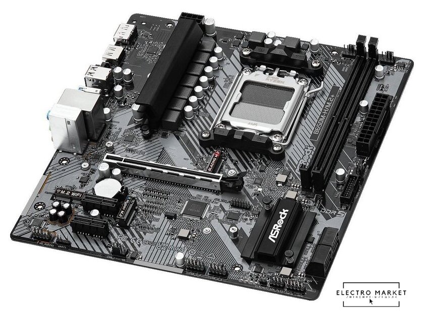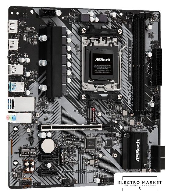 mATX, чипсет AMD B650, память 2xDDR5 до 6400 МГц, слоты: 1xPCIe x16 4.0, 1xPCIe x1, 1xM.2, 802.11ax (Wi-Fi 6E)+Bluetooth 5.3, 5+2+2 фаз питания