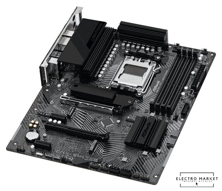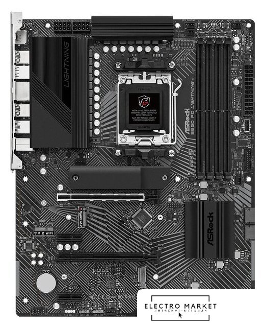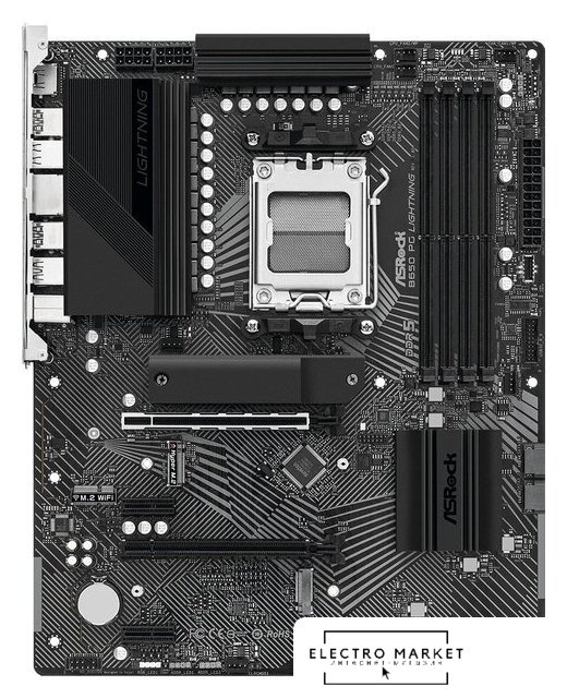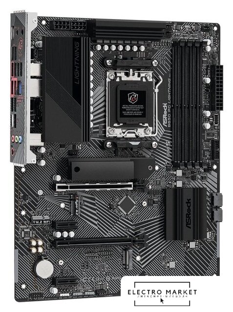 mATX, чипсет AMD B850, память 4xDDR5 до 8000 МГц, слоты: 1xPCIe x16 5.0, 1xPCIe x4, 3xM.2, 802.11ax (Wi-Fi 6E)+Bluetooth 5.2, 8+2+1 фаз питания