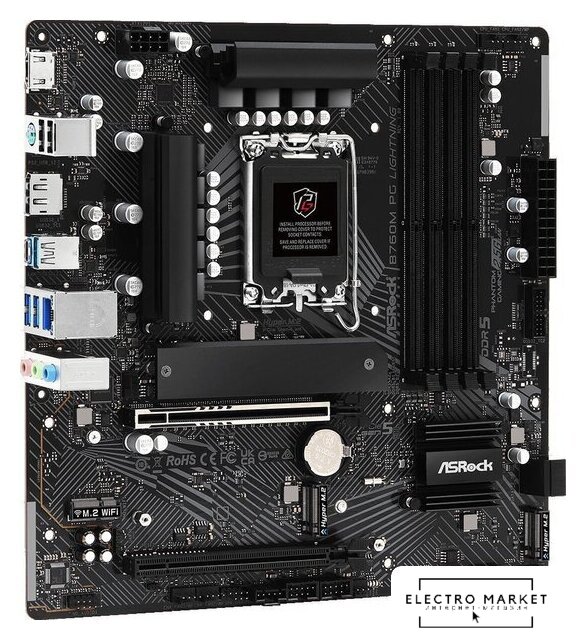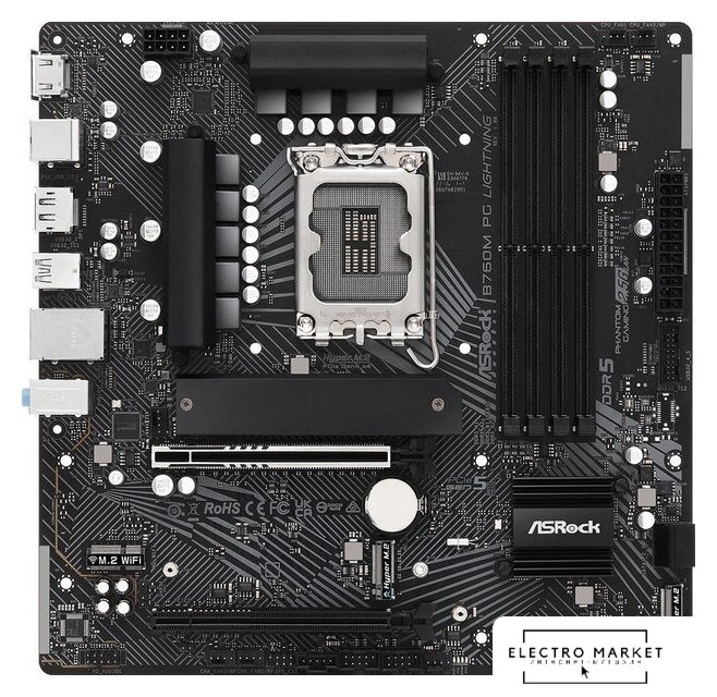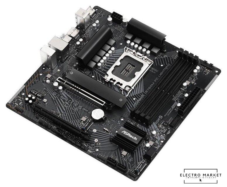 mATX, сокет Intel LGA1700, чипсет Intel B760, память 2xDDR5 до 7200 МГц, слоты: 1xPCIe x16 4.0, 2xPCIe x1, 2xM.2, 7+1+1 фаз питания