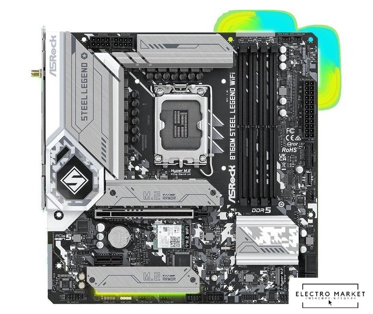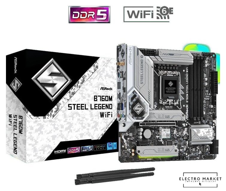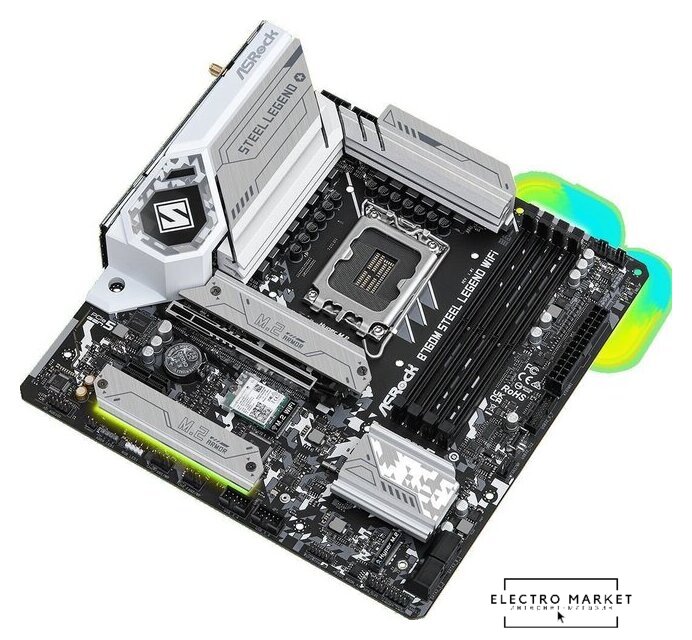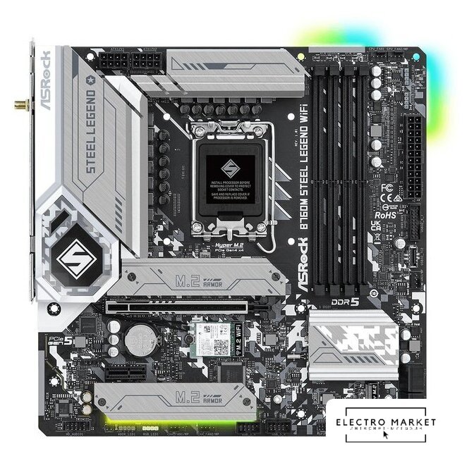 mATX, сокет Intel LGA1700, чипсет Intel B760, память 4xDDR5 до 6200 МГц, слоты: 1xPCIe x16 4.0, 2xPCIe x1, 2xM.2