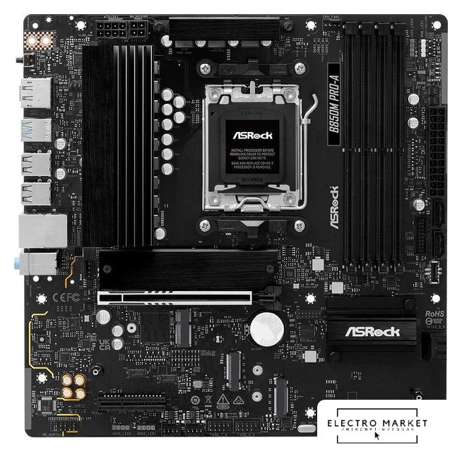 mATX, сокет AMD AM5, чипсет AMD B650, память 4xDDR5, слоты: 2xPCIe x16, 1xPCIe x1, 2xM.2
