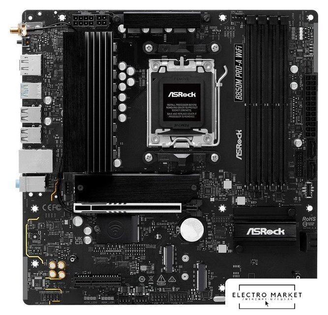 mATX, чипсет AMD B850, память 4xDDR5 до 8000 МГц, слоты: 1xPCIe x16 5.0, 1xPCIe x1, 3xM.2, 802.11ax (Wi-Fi 6E)+Bluetooth 5.3, 8+2+1 фаз питания