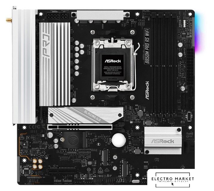 mATX, сокет AMD AM5, чипсет AMD B650, память 4xDDR5 до 7600 МГц, слоты: 1xPCIe x16, 2xPCIe x1, 2xM.2, 802.11ax (Wi-Fi 6)+Bluetooth 5.2