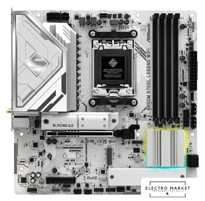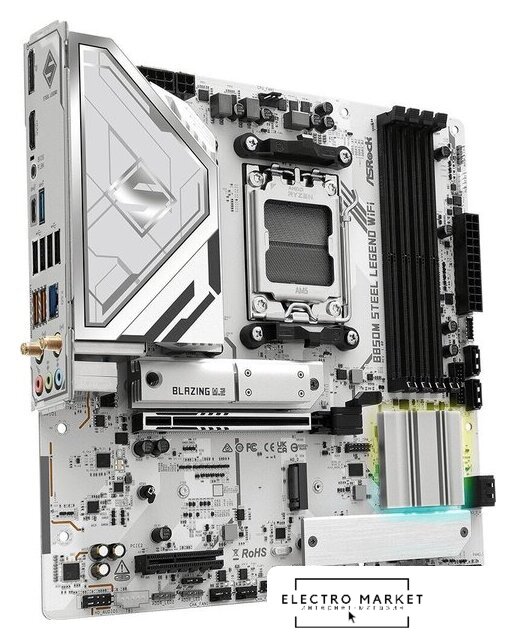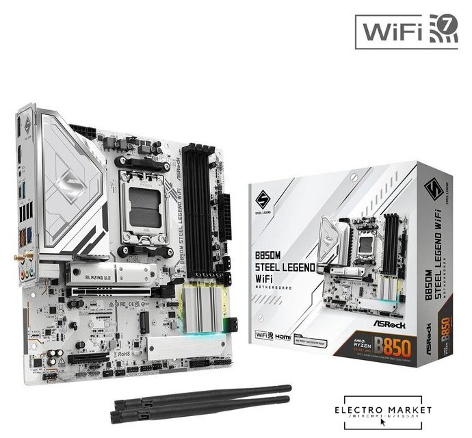 mATX, чипсет AMD B850, память 4xDDR5 до 8000 МГц, слоты: 1xPCIe x16 5.0, 1xPCIe x4, 3xM.2, 802.11be (Wi-Fi 7)+Bluetooth 5.4, 12+2+1 фаз питания