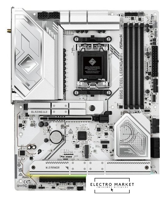 mATX, сокет AMD AM5, чипсет AMD B850, память 4xDDR5 до 8200 МГц, слоты: 2xPCIe x16 5.0, 2xM.2, 802.11ax (Wi-Fi 6E)+Bluetooth 5.3, 12+2+2 фаз питания