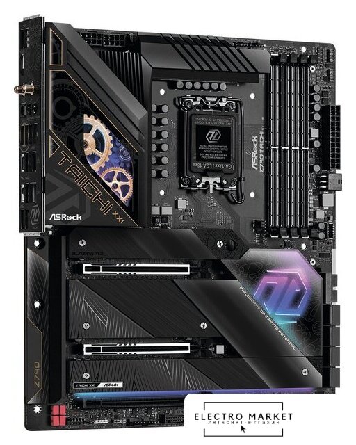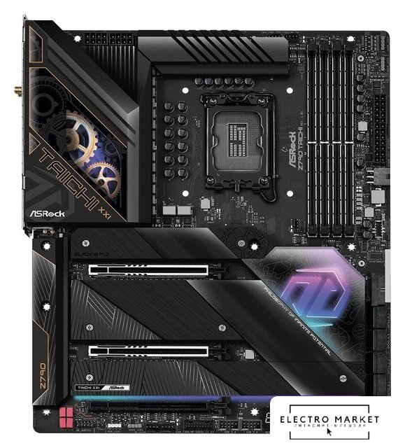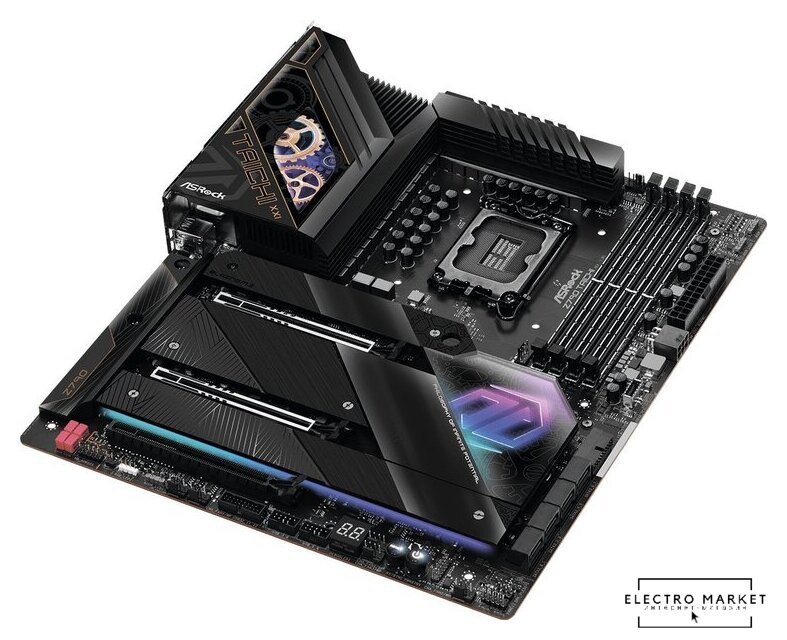 eATX, сокет Intel LGA1700, чипсет Intel Z690, память 2xDDR5 до 7000 МГц, слоты: 3xPCIe x16 5.0, 4xM.2, 802.11ax (Wi-Fi 6E)+Bluetooth 5.2, 15+1+2 фаз питания