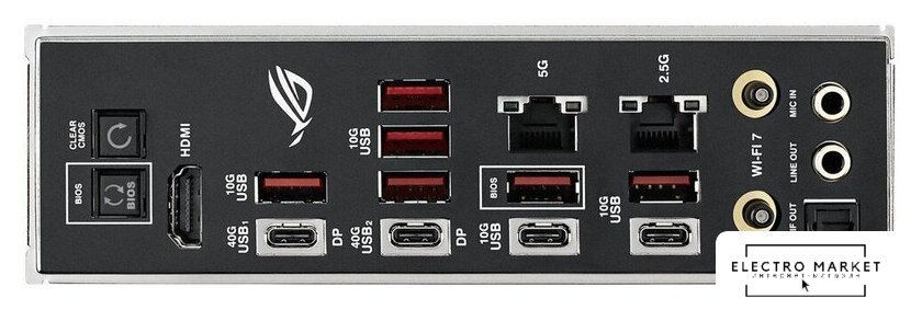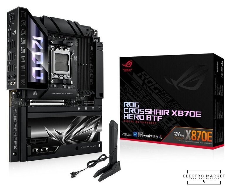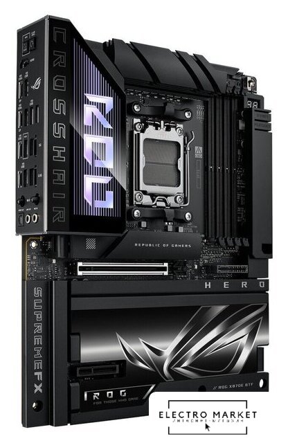 eATX, чипсет AMD X870E, память 4xDDR5 до 9000 МГц, слоты: 2xPCIe x16 5.0, 5xM.2, 802.11be (Wi-Fi 7)+Bluetooth 5.4, 20+2+2 фаз питания