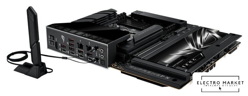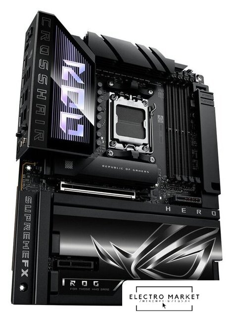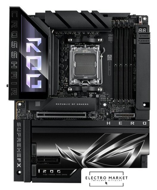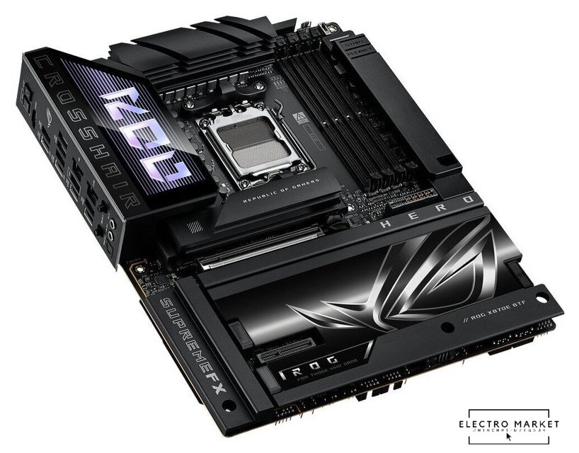 eATX, сокет AMD AM5, чипсет AMD X670E, память 4xDDR5 до 7800 МГц, слоты: 2xPCIe x16 5.0, 4xM.2, 24+2+1 фаз питания
