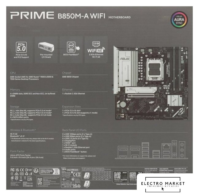 mATX, чипсет AMD B850, память 4xDDR5/DDR5 CUDIMM до 8200 МГц, слоты: 1xPCIe x16 5.0, 2xPCIe x1, 2xM.2, 802.11ax (Wi-Fi 6E)+Bluetooth 5.3, 10+2+1 фаз питания