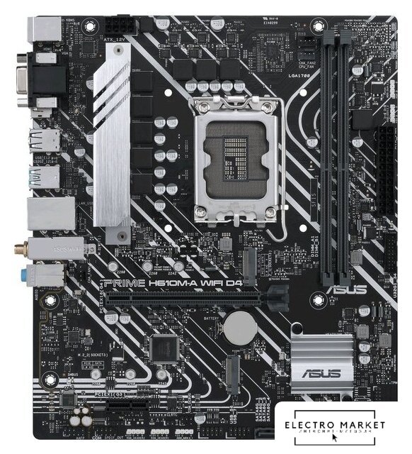 mATX, сокет Intel LGA1700, чипсет Intel H610, память 2xDDR4 до 3200 МГц, слоты: 1xPCIe x16 4.0, 2xPCIe x1, 1xM.2