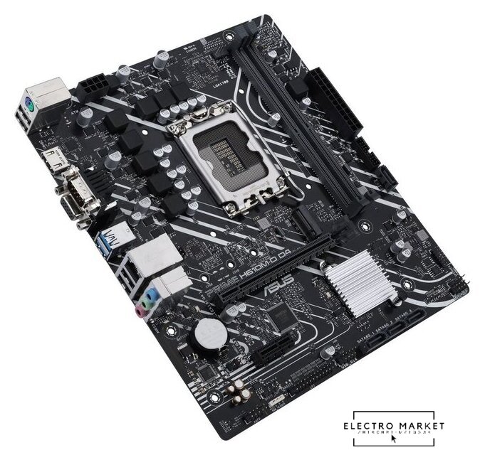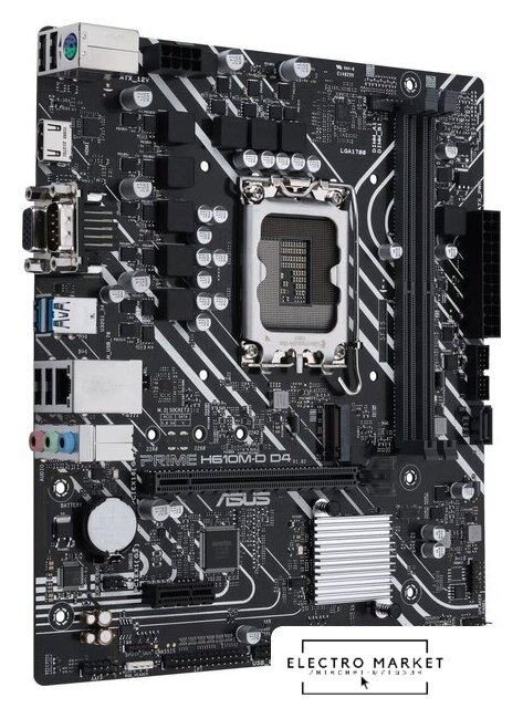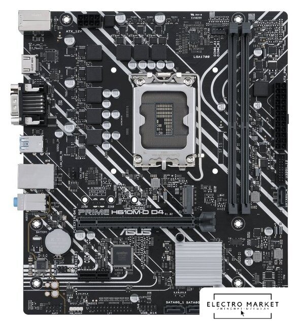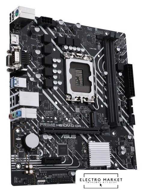 mATX, сокет Intel LGA1700, чипсет Intel H610, память 2xDDR5 до 5600 МГц, слоты: 1xPCIe x16, 1xPCIe x1, 1xM.2