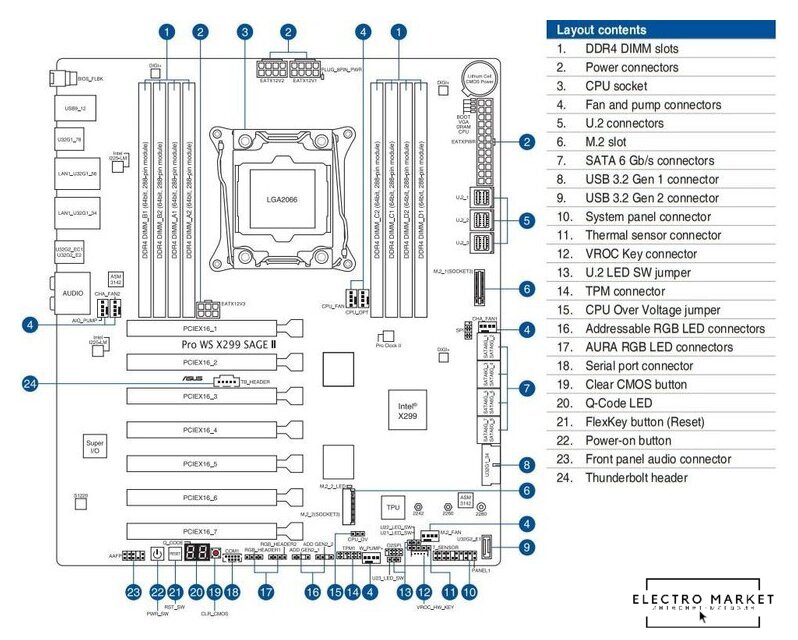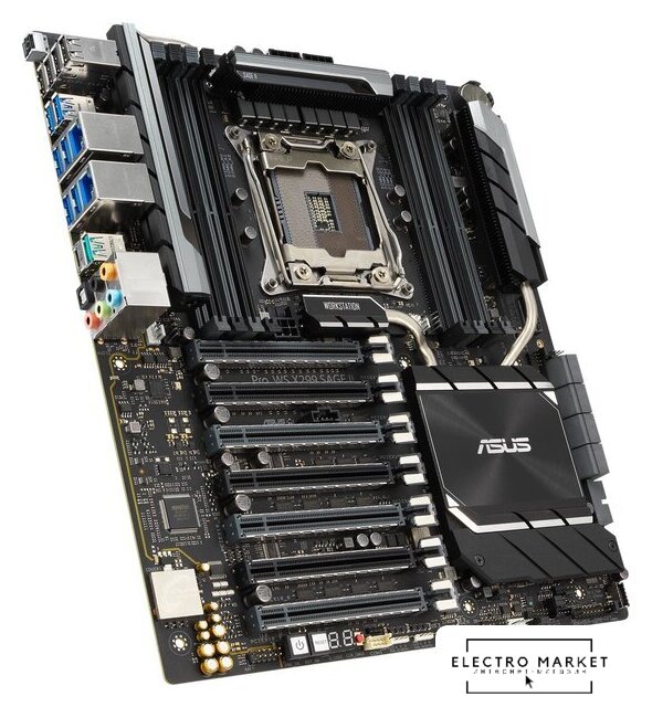 SSI EEB, сокет AMD TR5, чипсет AMD WRX90, память 8xDDR5 до 7600 МГц, слоты: 7xPCIe x16 5.0, 2xM.2, 18+3+3 фаз питания