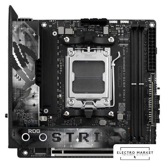 Mini-ITX, сокет AMD AM5, чипсет AMD X670E, память 2xDDR5 до 8000 МГц, слоты: 1xPCIe x16 5.0, 2xM.2, 802.11ax (Wi-Fi 6E)+Bluetooth 5.2, 10+2+1 фаз питания