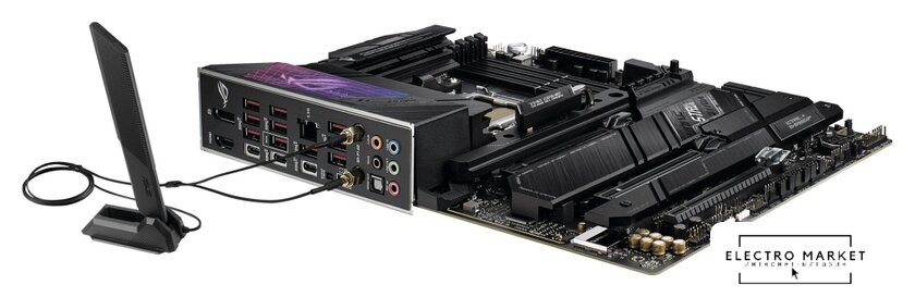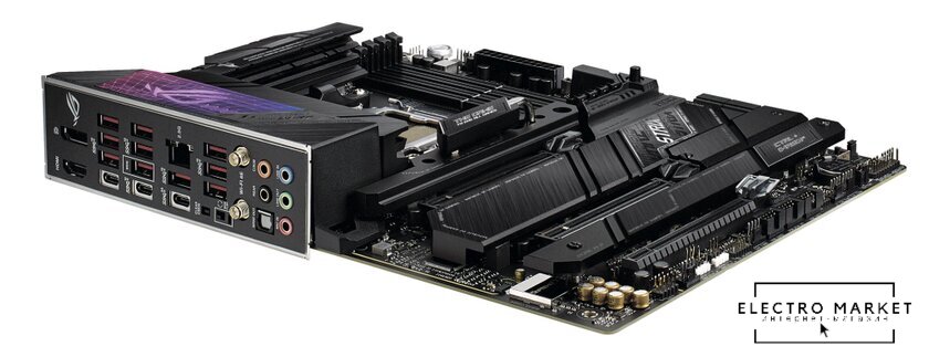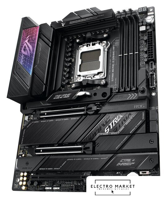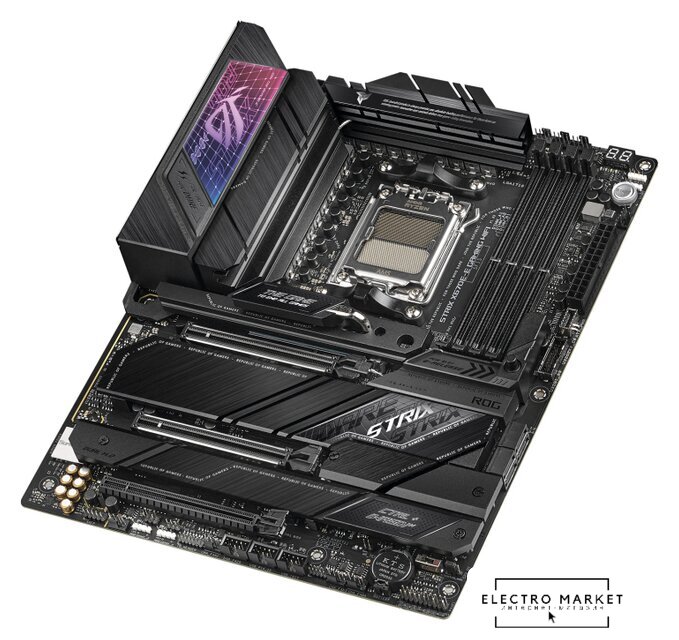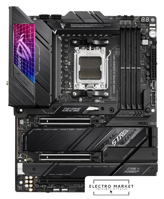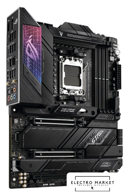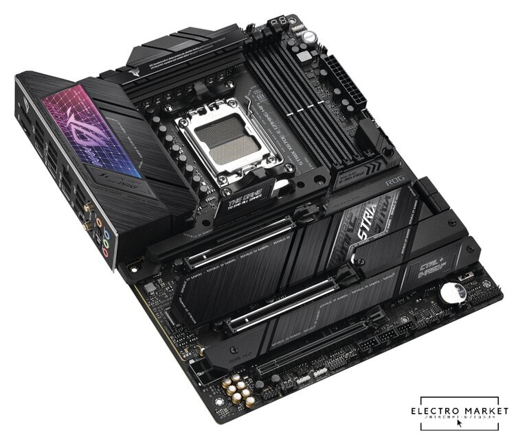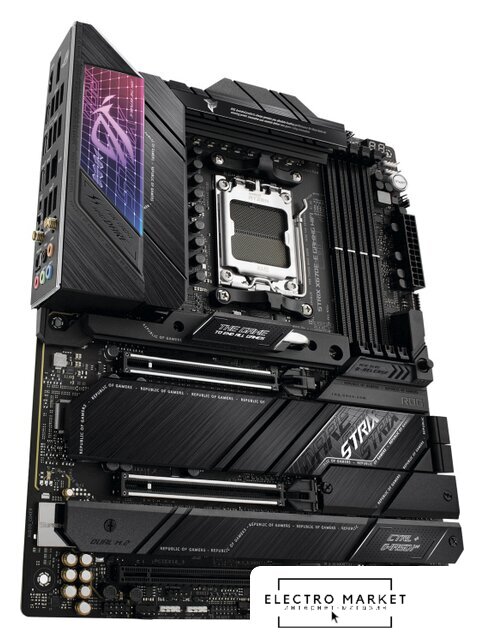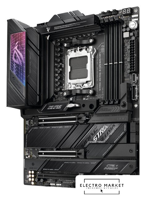eATX, сокет AMD AM5, чипсет AMD X670E, память 4xDDR5 до 7800 МГц, слоты: 2xPCIe x16 5.0, 4xM.2, 24+2+1 фаз питания