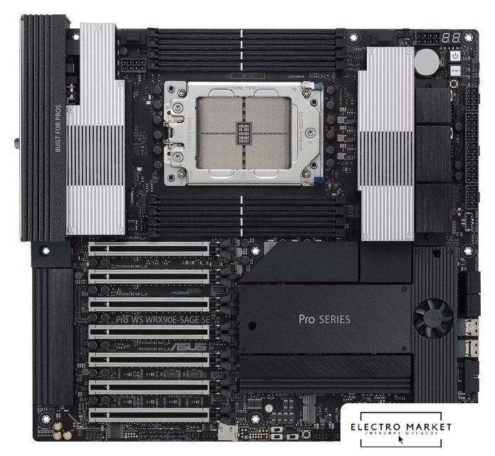 SSI EEB, сокет AMD TR5, чипсет AMD WRX90, память 8xDDR5 до 7600 МГц, слоты: 7xPCIe x16 5.0, 2xM.2, 18+3+3 фаз питания
