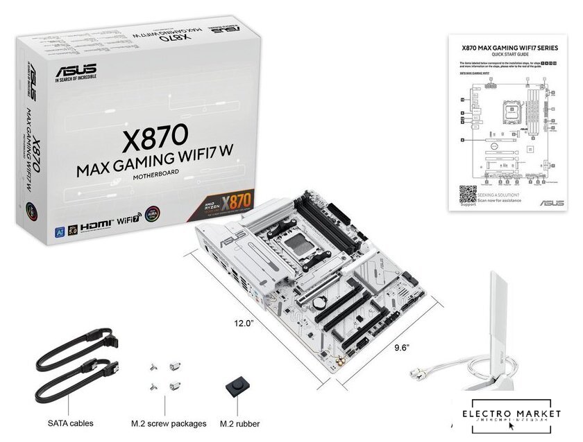 Комплектация | - кабель SATA - Wi-Fi антенна - пакет с резиновыми уплотнителями для M.2 - пакет с винтами для M.2 SSD - документация |