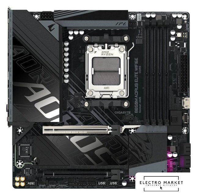 mATX, чипсет AMD B850, память 4xDDR5 до 8000 МГц, слоты: 4xPCIe x16 5.0, 3xM.2, 802.11ax (Wi-Fi 6)+Bluetooth 5.4, 8+2+1 фаз питания