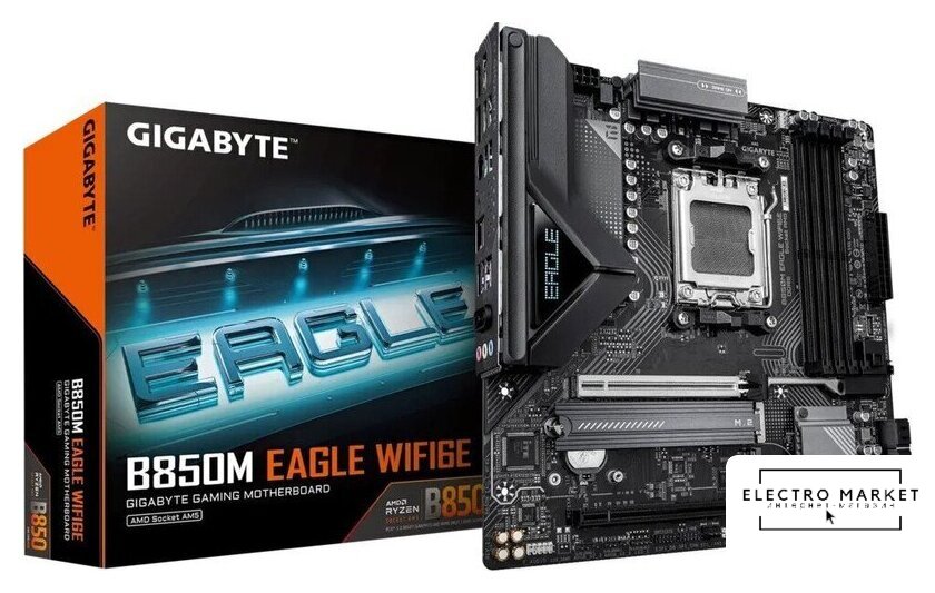 mATX, чипсет AMD B850, память 4xDDR5 до 8000 МГц, слоты: 4xPCIe x16 5.0, 3xM.2, 802.11ax (Wi-Fi 6)+Bluetooth 5.4, 8+2+1 фаз питания