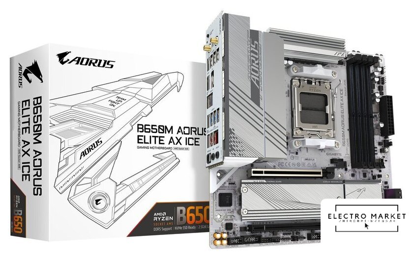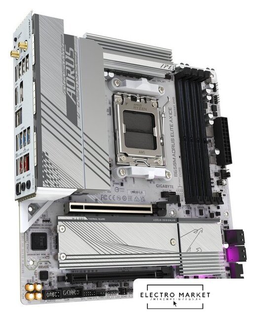 mATX, сокет AMD AM5, чипсет AMD B650, память 4xDDR5 до 8000 МГц, слоты: 2xPCIe x16 4.0, 2xM.2, 802.11ax (Wi-Fi 6E)+Bluetooth 5.2, 12+2+1 фаз питания