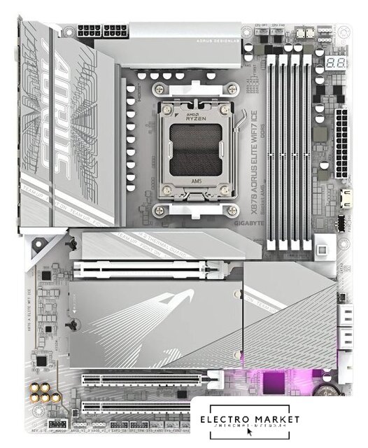 ATX, чипсет AMD X870, память 4xDDR5 до 8000 МГц, слоты: 4xPCIe x16 5.0, 3xM.2, 802.11be (Wi-Fi 7)+Bluetooth 5.4, 12+2+1 фаз питания