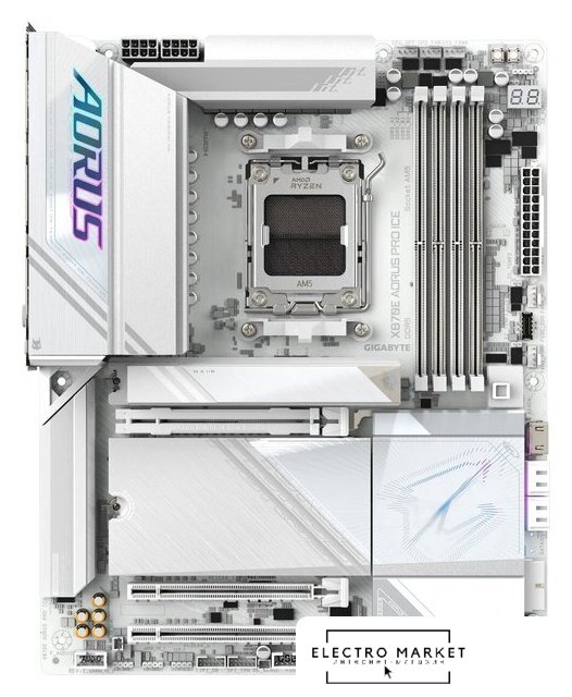 ATX, чипсет AMD X870E, память 4xDDR5 до 8200 МГц, слоты: 3xPCIe x16 5.0, 4xM.2, 802.11be (Wi-Fi 7)+Bluetooth 5.4, 16+2+2 фаз питания