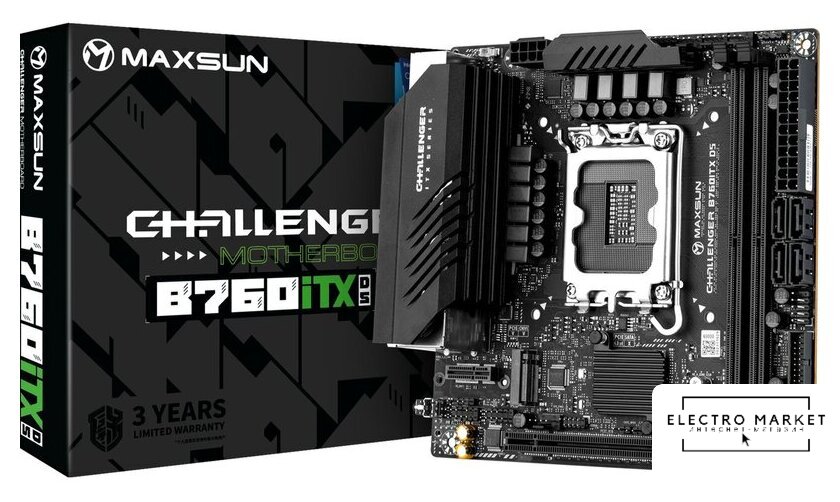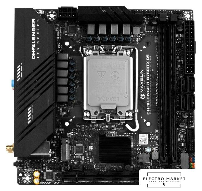 mATX, чипсет Intel B760, память 4xDDR5 до 5600 МГц, слоты: 1xPCIe x16 5.0, 2xPCIe x1, 2xM.2, 6+2+1 фаз питания
