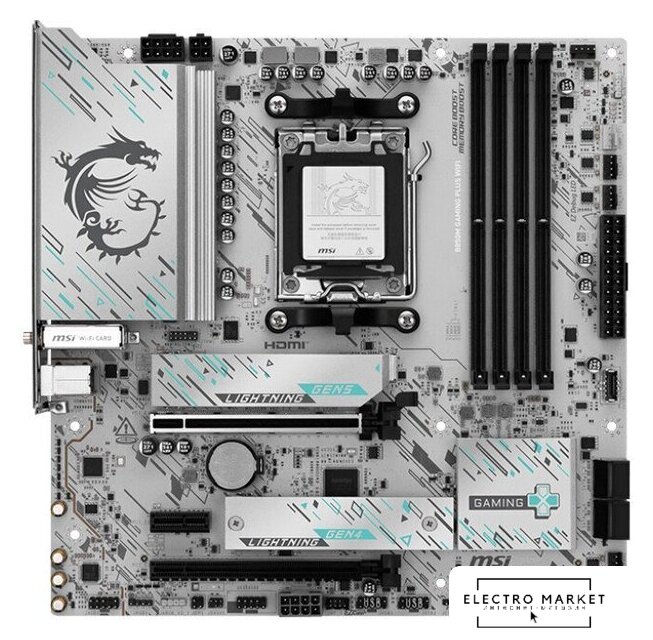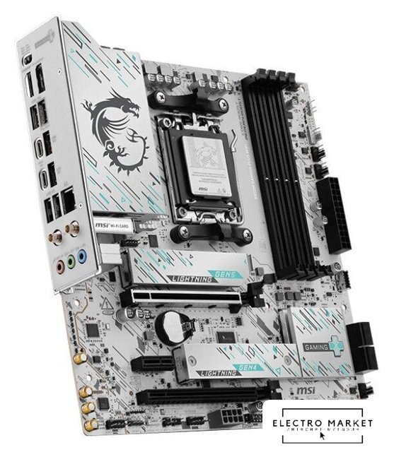 ATX, чипсет AMD B850, память 4xDDR5 до 8000 МГц, слоты: 4xPCIe x16 5.0, 3xM.2, 802.11ax (Wi-Fi 6E)+Bluetooth 5.3, 8+2+1 фаз питания