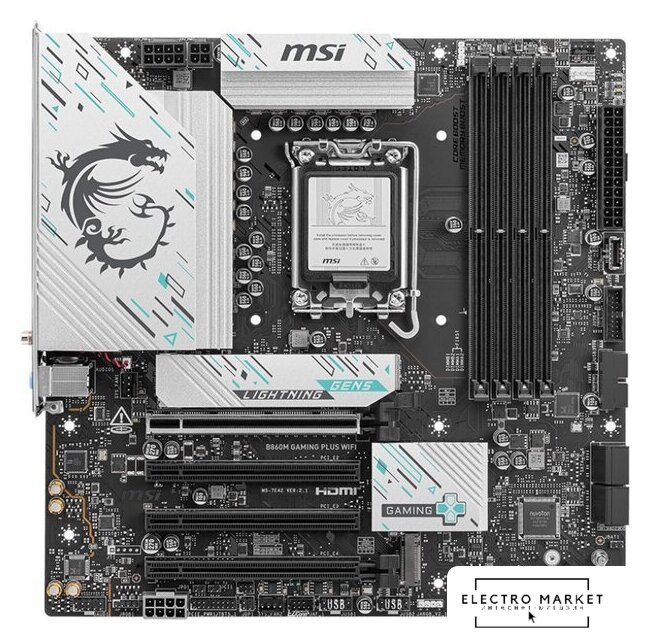 mATX, чипсет Intel B860, память 4xDDR5/DDR5 CUDIMM до 8666 МГц, слоты: 2xPCIe x16 5.0, 1xPCIe x1, 2xM.2, 7+1+1+1 фаз питания