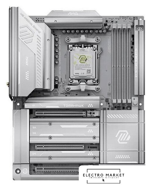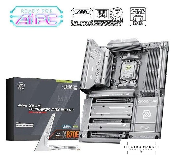 eATX, сокет AMD AM5, чипсет AMD X870E, память 4xDDR5 до 8200 МГц, слоты: 2xPCIe x16 5.0, 4xM.2, 802.11be (Wi-Fi 7)+Bluetooth 5.4, 24+2+1 фаз питания