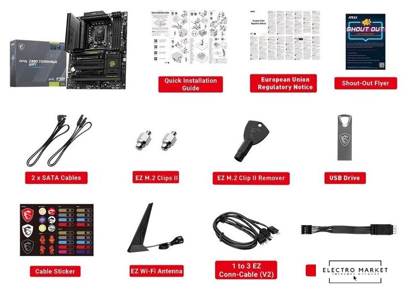 Комплектация | - EZ Wi-Fi антенна - USB Flash накопитель - стикеры для кабелей- 2 кабеля SATA- EZ кабель фронтальной панели- 1EZ - 3EZ кабель - ключ-экстрактор EZ M.2 Clip II - 2 винта со стойкой EZ M.2 Clip II- документация |