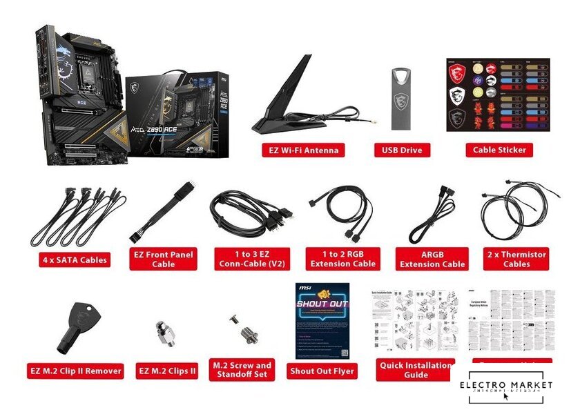 Комплектация | - EZ Wi-Fi антенна - USB Flash накопитель - стикеры для кабелей- 4 кабеля SATA- EZ кабель фронтальной панели- 1EZ - 3EZ кабель - 1RGB - 2RGB кабель-удлинитель - ARGB кабель-удлинитель- 2 кабеля термистора - ключ-экстрактор EZ M.2 Clip II - монтажный комплект для M.2- документация |