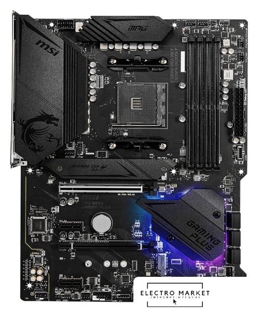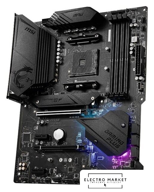 ATX, сокет AMD AM4, чипсет AMD B550, память 4xDDR4 до 4733 МГц, слоты: 2xPCIe x16 4.0, 3xPCIe x1, 2xM.2, 10+3 фаз питания